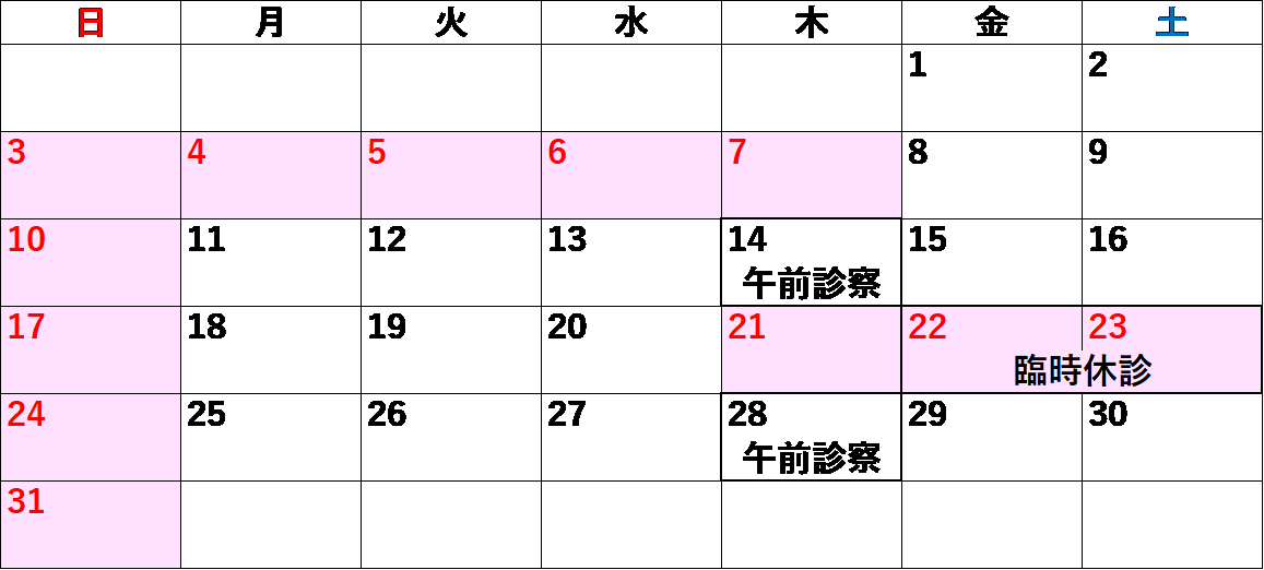 カテゴリー 未分類 令和8年5月診察日のお知らせ 投稿者 作成者: mgclinicstaff 投稿日 2026年3月4日 5月22日(金)と23日(土)は学会出席のため臨時休診となります。 14日(木)午前中および28日(木)午前中を診察日としますのでご了承ください。 ← 臨時休診のお知らせ